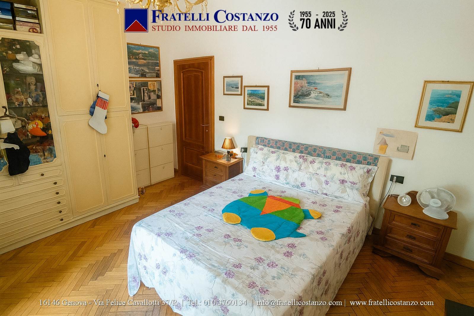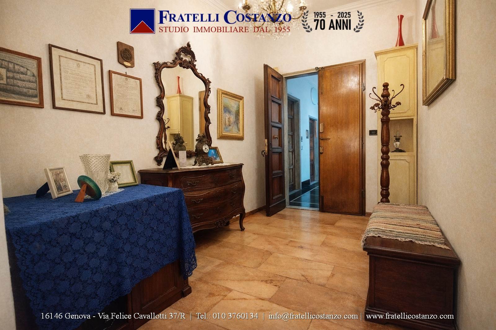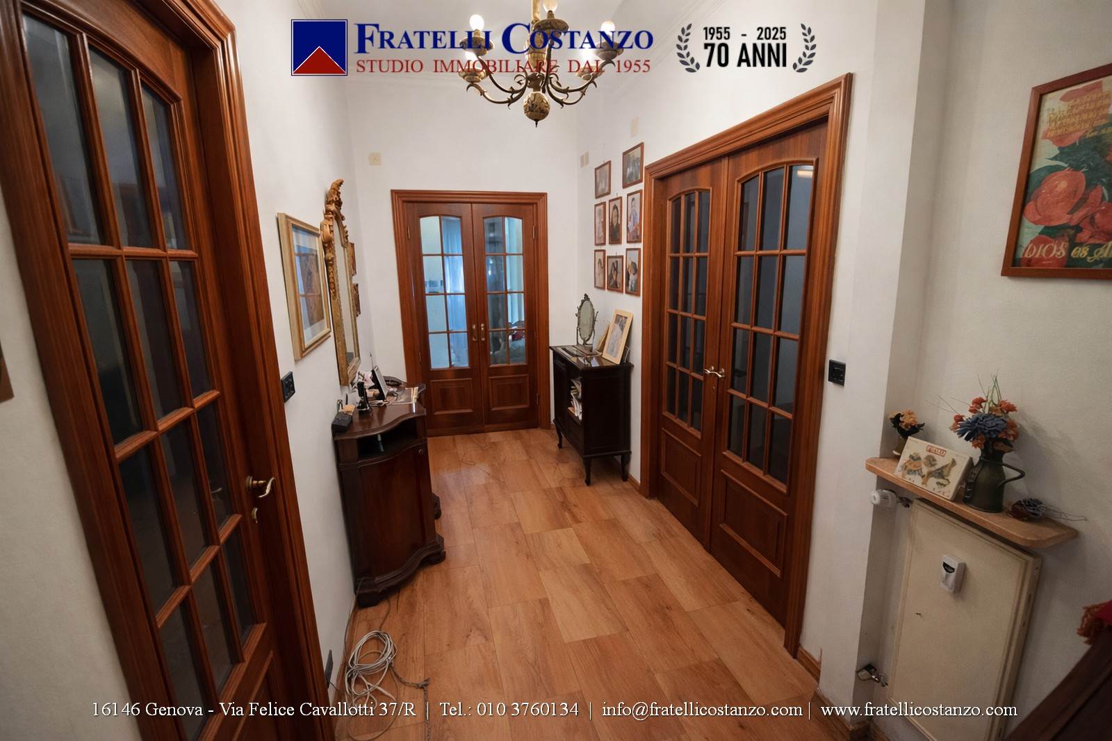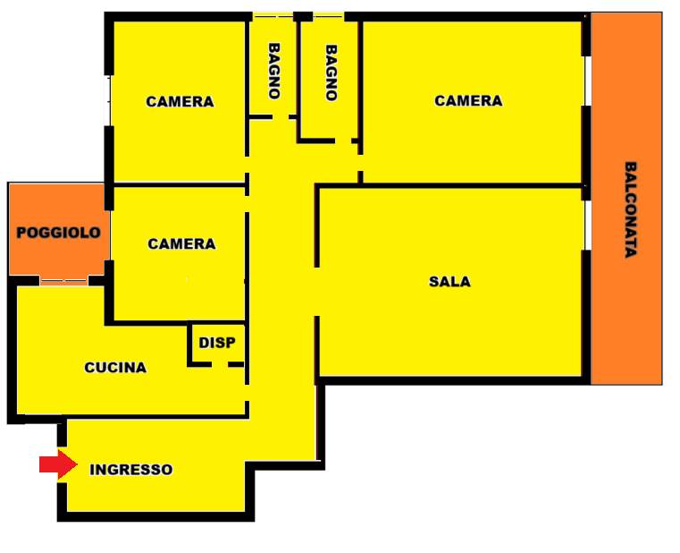 Ingresso, ampia sala, cucina, doppi servizi finestrati, ripostiglio, tre camere da letto (matrimoniale, media, singola).